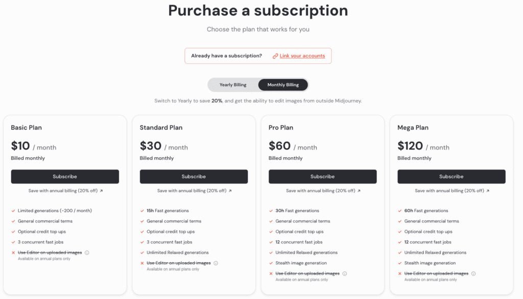 Now, let’s talk plans. Midjourney isn’t free, but it’s worth every penny. If you’re just dipping your toes in, the $10/month plan is perfect for experimenting without breaking the bank. Trust me, once you see what you can create, you’ll be hooked.