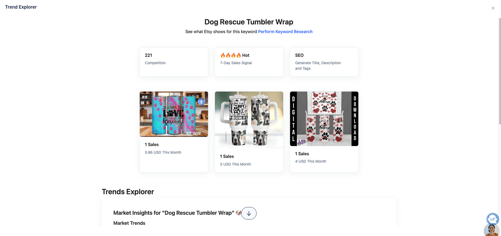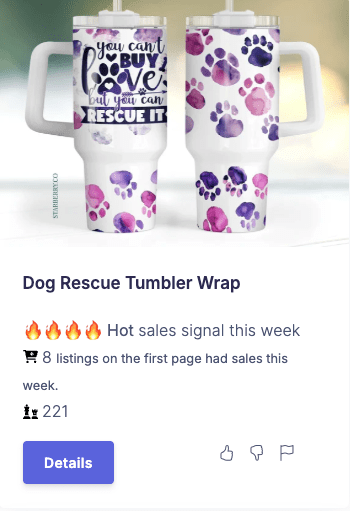 - Insight Factory: I use Insight Factory to find low competiton products that are starting to trend or have an uptick in search volume, such as this “Dog Rescue Tumbler Wrap”. You can click on details and more info pops up. From here you can click on perform keyword research trend to get associated keywords of the top performing listings for this search term. I grew my clipart store to 3000 sales in less than a year just by jumping on these trends!