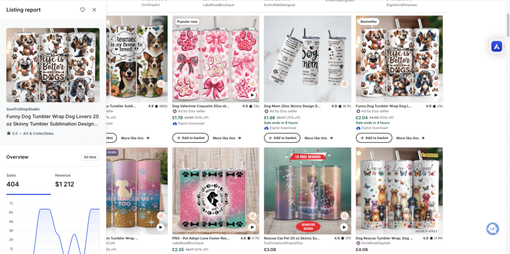 - Alura: Alura functions similarly to everbee with it’s own browser plugin and you can use it to conduct competitor analysis. Search for similar products and identify which designs are performing well. Alura shows you the keywords associated with top-selling items, allowing you to refine your strategy by aligning your keywords and descriptions with successful listings. With the plugin you can click the Alura logo on any listing and a side pane pops open and shows you more details, with a paid plan this gets you access to revenue and sales volume. Keywords access is free.