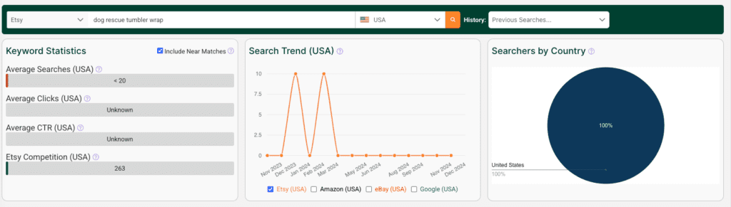 Erank: Start by entering your product idea, like “dog rescue tumbler wrap,” into Erank. It provides detailed insights into keyword performance, allowing you to discover high-traffic and low-competition keywords. This helps you choose the most effective terms to include in your product titles and descriptions.