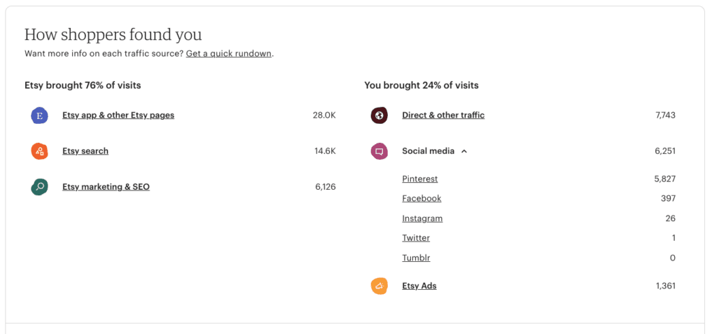 Here’s the example for Clip Craft for 2024. 24% of my stores traffic was driven by me! Most of which came from Pinterest, using Pinterest for marketing and promoting your store is not one to snooze on friends!
